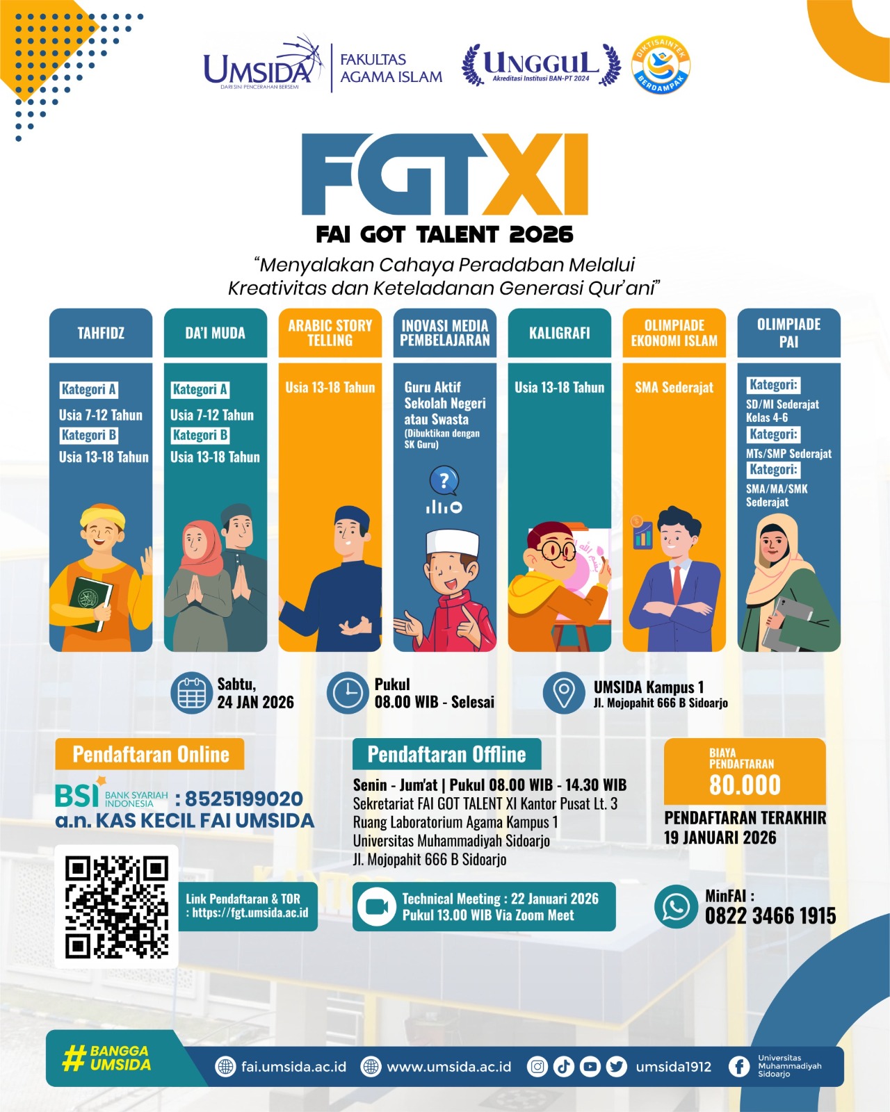 Perkembangan pendidikan saat ini sangat pesat beriringan dengan berkembangnya bakat, minat dan kemampuan siswa. Untuk itu Fakultas Agama Islam UMSIDA akan memberikan wadah untuk menyalurkan bakat, minat dan kemampuan siswa tersebut dalam bentuk “FAI GOT TALENT 2026” untuk siswa SD/MI, SMP/ MTs, SMA/SMK/MA/MAK sederajat, Guru dan mahasiswa perguruan tinggi umum baik negeri maupun swasta. Hal ini sesuai dengan tag-line UMSIDA yaitu menjadi “Kampus Pencerahan” maka program FAI Got Talent 11 adalah Program Unggulan bagi Fakultas Agama Islam yang bersinergi dengan Badan Eksekutif Mahasiswa, Himaprodi PAI, PBA, Perbankan Syariah, S2 MPI dan Ikatan Mahasiswa Alumni FAI UMSIDA.